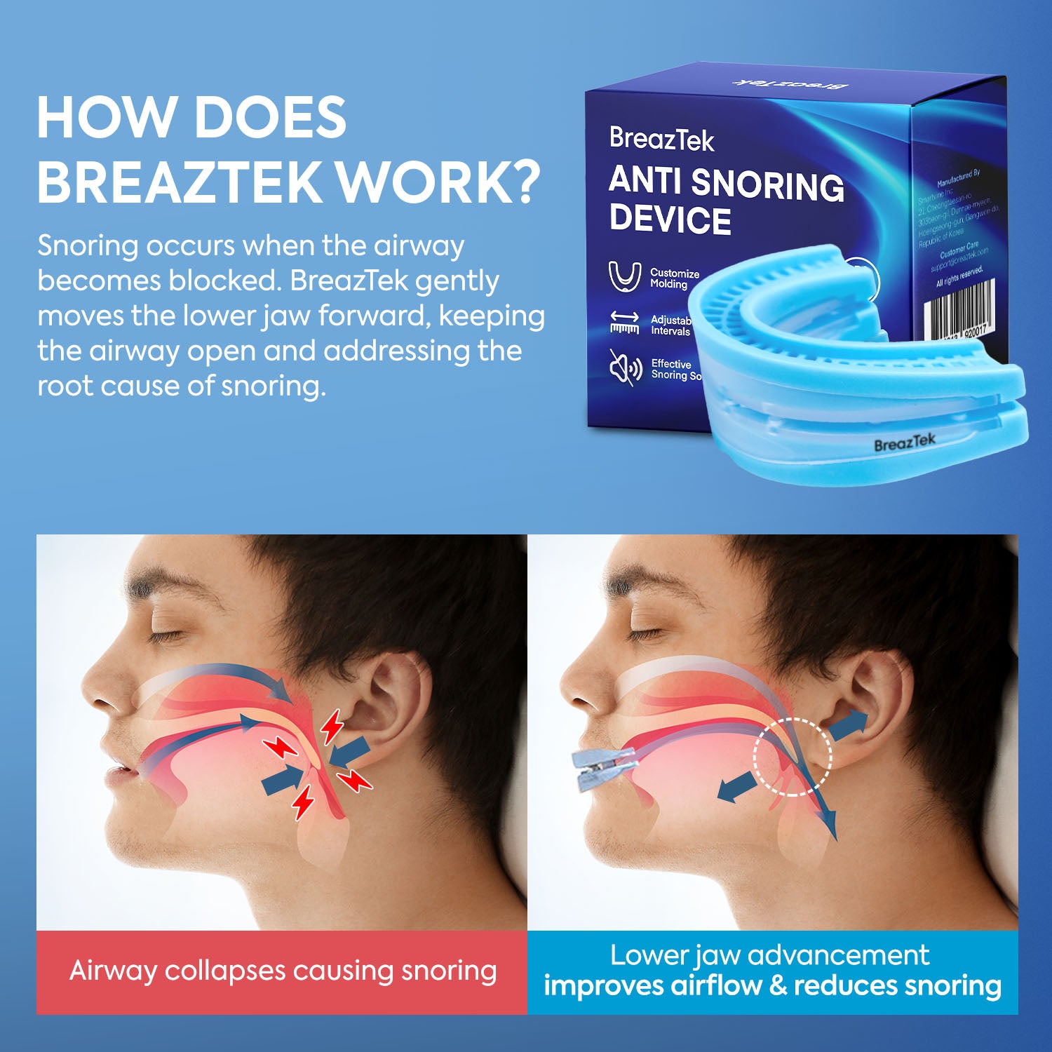 ADJUSTABLE DESIGN: Custom-fit mouthpiece that can be adjusted for optimal comfort and effectiveness during sleep
